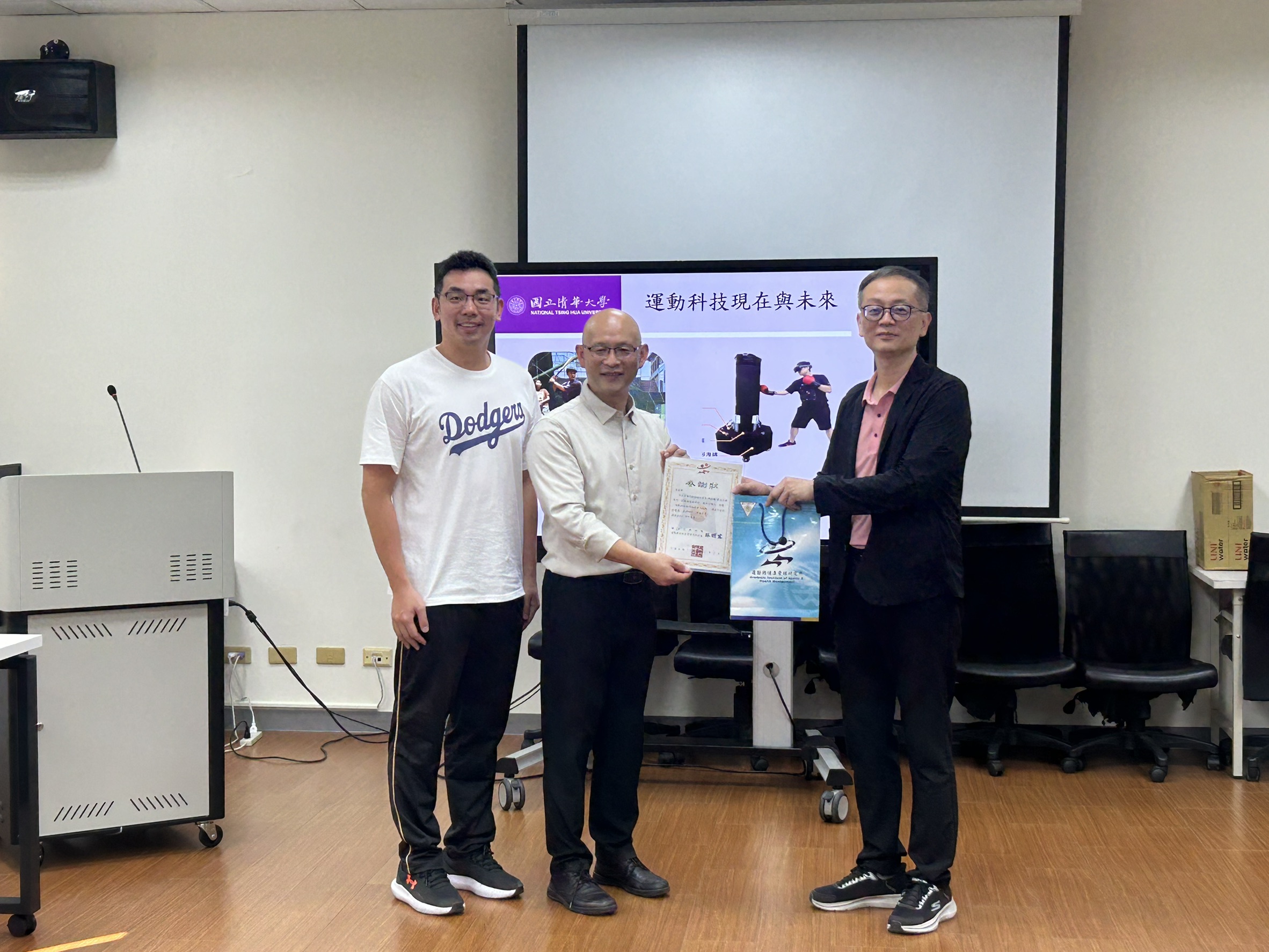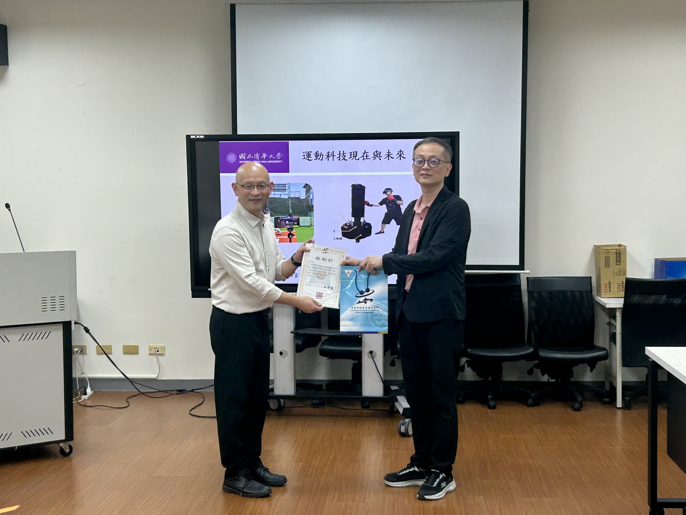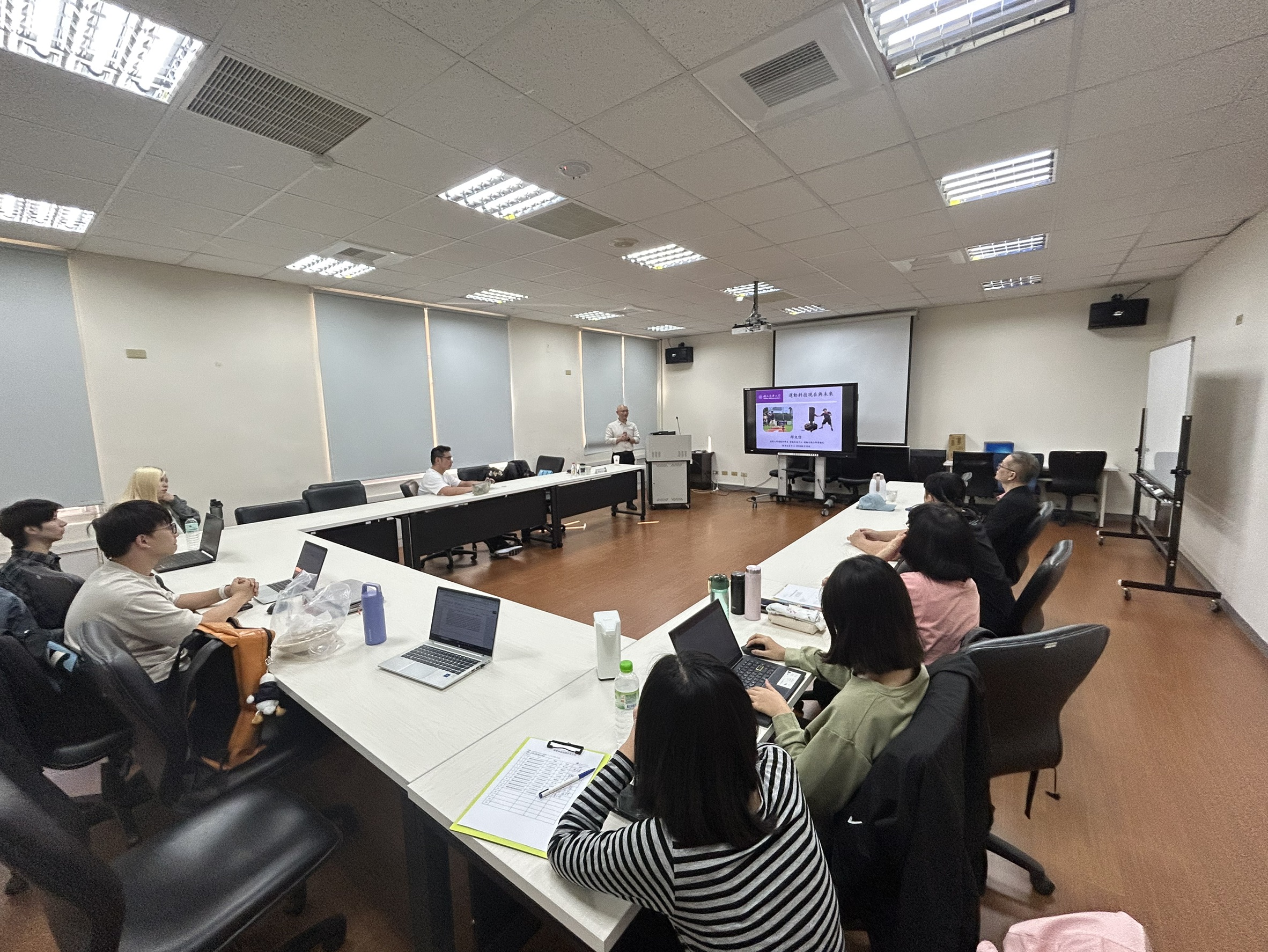 隨後,邱教授分享科技如何為運動科學帶來革命性的改變。他以淺顯方式介紹從訓練優化、智慧場館,以及體驗經濟等角度,進行介紹與實務案例分享。此外,邱教授介紹他在國科會精準運動科學計畫及各項合作計畫中累積的研究成果,包含跨校、跨領域的運動科技研發與產學合作。他展現的不僅是研究熱忱,更是持續把科技成果帶回訓練場的使命感及服務教練選手的熱忱,令與會師生感佩。